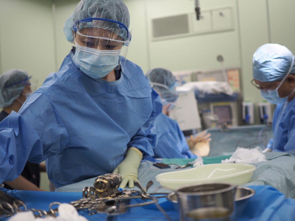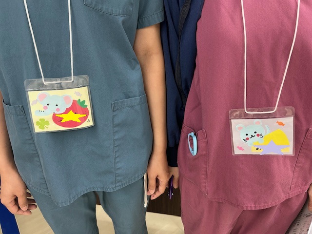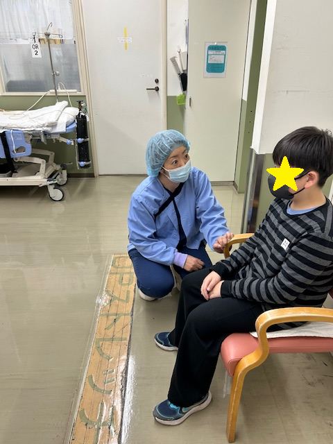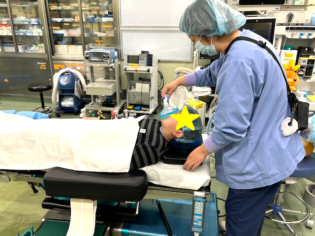 手術室 当院手術室は外科、整形外科、産婦人科、泌尿器科、脳外科、耳鼻科、脳外科、皮膚科、腎臓内科の9科の手術を行っています。夜間、土日祝日はオンコール体制とし、緊急手術に対応しています。 手術室では、手術室看護師による術前オリエンテーションを実施しています。対象はリスクのある方、不安が大きい方、手術に関する質問がある方です。小児手術については全ての患者さんに術前オリエンテーションを行っています。私たちは、お子様にも十分な説明をすることで理解できる力があると考え、様々な工夫をしています。例えば、手術室看護師がパンフレットやぬいぐるみを使った説明を行い、実際に使用するマスクなどに触れてみたり、口元にあててみたりすることで、恐怖心を和らげています。また「手術室見学ツアー」では、実際に手術室に入り、手術台に横になり、マスクを当てる体験も提供しています。 また手術室看護師のスキル向上のために定期的に勉強会やシミュレーションなどを行い、質の高い、統一した看護ができるよう教育体制を整えています。 手術という大きな決断に対して、私達手術スタッフは麻酔科医、看護師、執刀医がチームとなり、患者さんの気持ちに寄り添い、安全で安心な手術を目指しています。不安や心配なことがありましたら、少しでも取りのぞけるよう対応させていただきます。 1人1人違う かわいい動物の手作り名札 実際に手術台に横になりマスクをあてる練習 入室時の安全確認練習 手術室専用ショベルカー